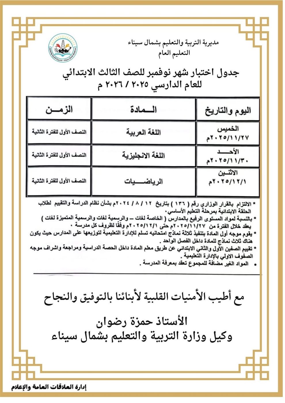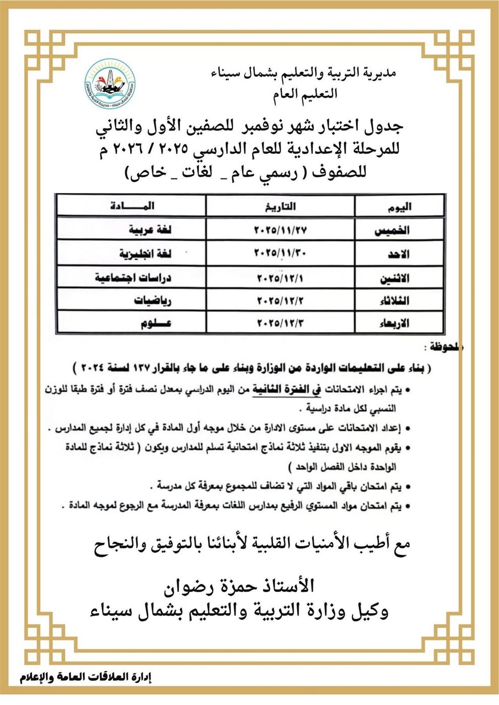 اليوم.. بدء امتحانات نوفمبر لطلاب الابتدائية والإعدادية والثانوية بشمال سيناء