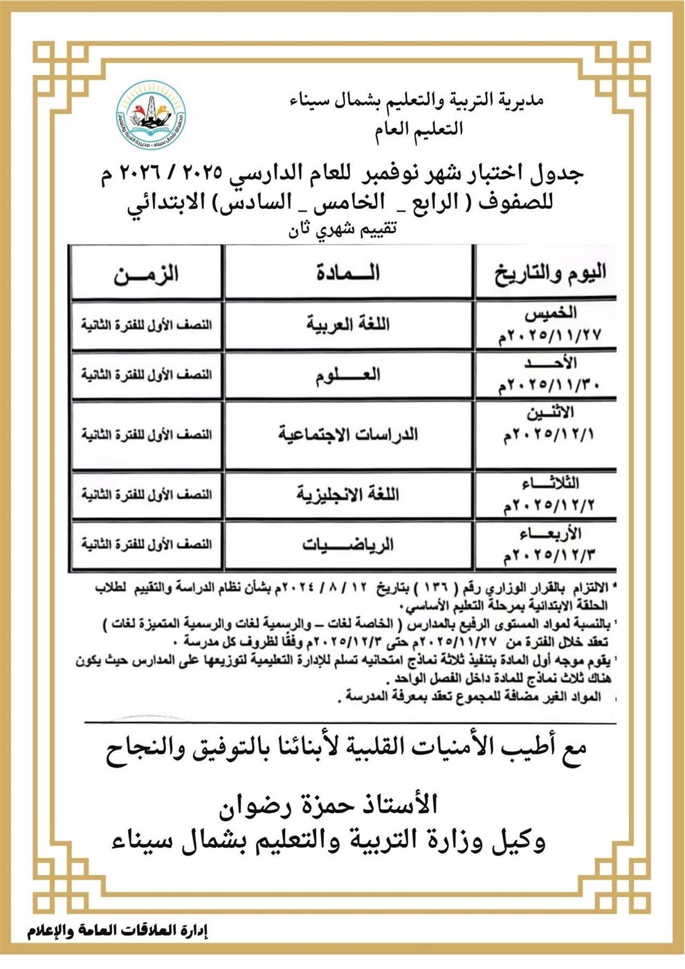 تبدأ مديرية التربية والتعليم بمحافظة شمال سيناء اليوم الخميس، امتحانات شهر نوفمبر لطلاب المرحلة الابتدائية والإعدادية والثانوية بعد العودة إلى المدارس، بسبب إجازة الانتخابات.
