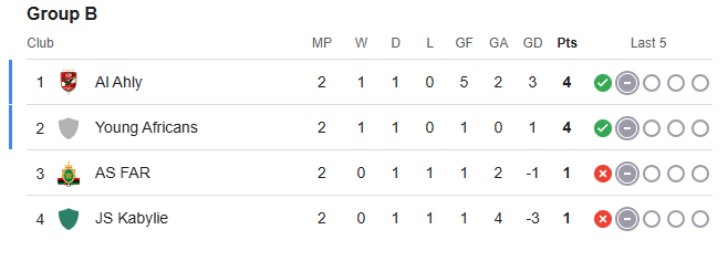 اشتعلت المنافسة في المجموعة بعد انتهاء الجولة الثانية، حيث يتصدر الأهلي ترتيب المجموعة برصيد 4 نقاط بعد تحقيقه فوزًا وتعادلًا دون أي هزيمة، بالتساوي مع فريق يانغ أفريكانز الذي يملك الرصيد نفسه من النقاط بعدما خاض هو الآخر مباراتين انتهتا بفوز وتعادل.