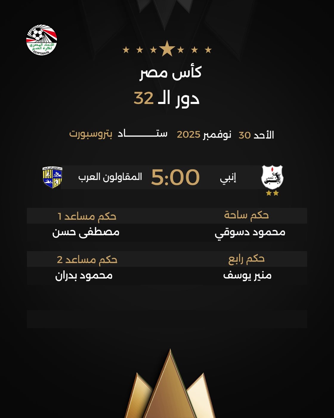 2. مباراة إنبي والمقاولون العرب وعلى ستاد "بتروسبورت"، يلتقي فريق إنبي مع نظيره المقاولون العرب في مواجهة قوية تنطلق في تمام الساعة 5:00 مساءً. وقد أسندت اللجنة إدارة المباراة للطاقم التالي: