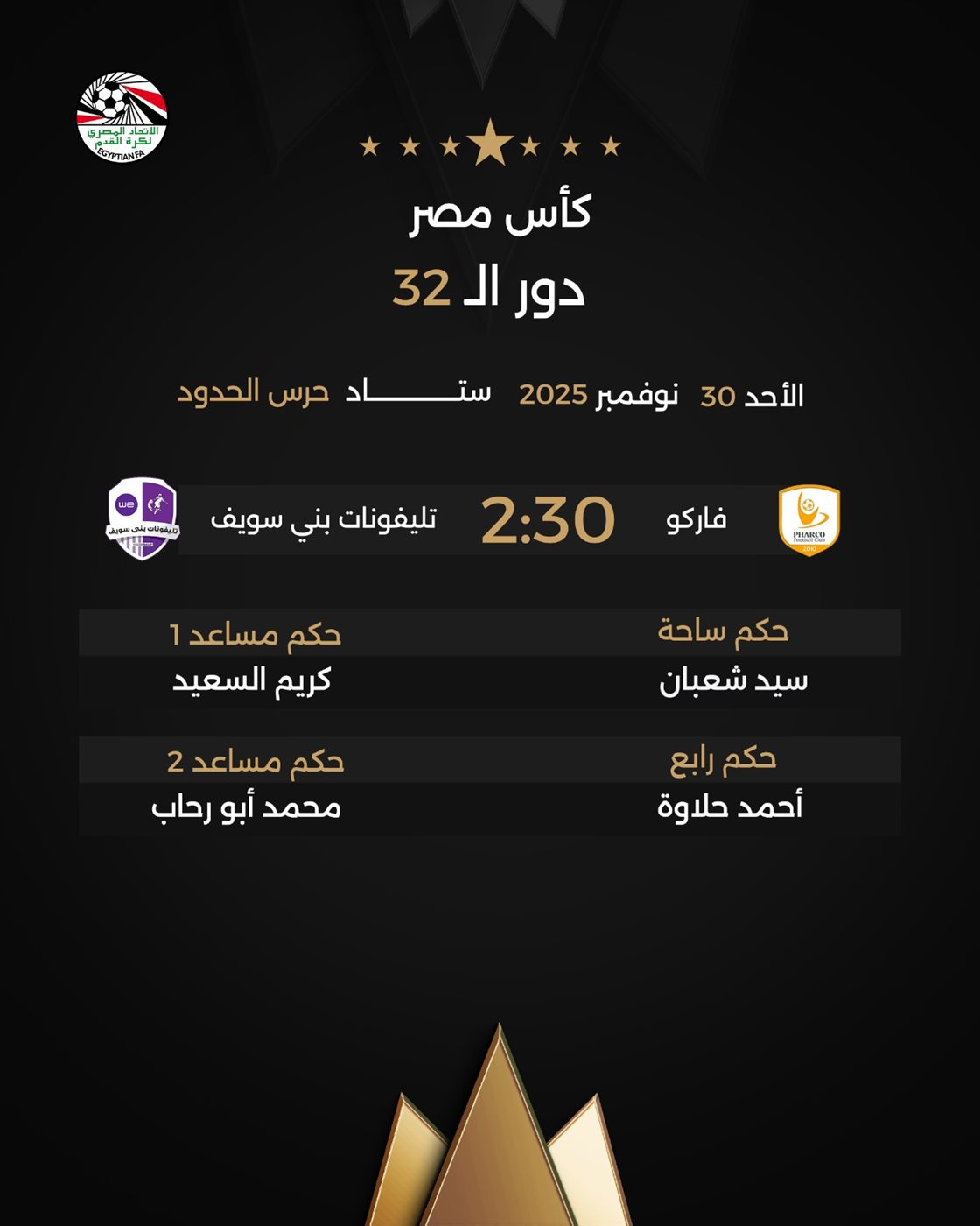 مباراة فاركو وتليفونات بني سويف يستضيف استاد حرس الحدود المواجهة التي تجمع بين فريقي فاركو وتليفونات بني سويف في تمام الساعة 2:30 عصرا، وسيدير اللقاء طاقم تحكيم مكون من: