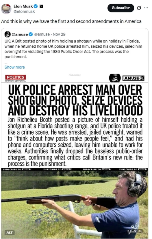 القضية أثارت أيضًا اهتمام الملياردير إيلون ماسك، الذي انتقد تصرف السلطات البريطانية وكتب: وهذا هو السبب في وجود التعديلين الأول والثاني في أمريكا.
