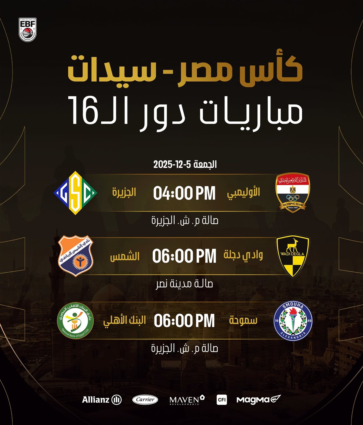 تنطلق يوم الجمعة المقبل، الموافق 5 ديسمبر 2025، منافسات دور الـ 16 من بطولة كأس مصر لسيدات كرة السلة، والتي ينظمها الاتحاد المصري لكرة السلة (EBF)، حيث تشهد الملاعب ثلاث مواجهات مرتقبة تجمع بين أندية القمة والمنافسين الطامحين في الصعود للأدوار النهائية.