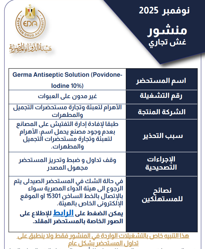 قررت هيئة الدواء المصرية سحب محلول مطهر مجهول المصدر يُدعى جيرما Germa Antiseptic Solution Povidone-Iodine 10% من السوق المصري، بعد ثبوت أن الجهة المنتجة له مجهولة وغير مُرخصة رسميًا.