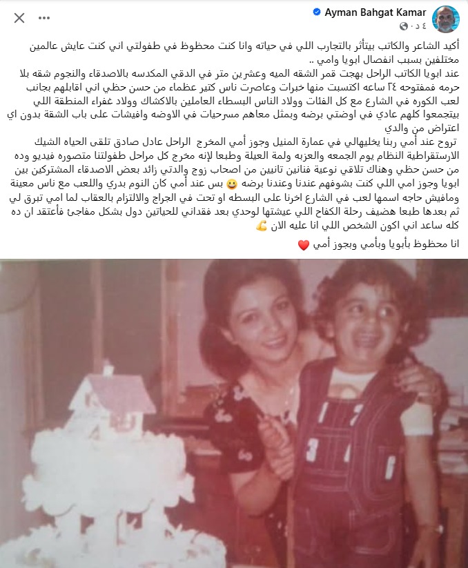 وكتب أيمن بهجت قمر منشورا، عبر حسابه الشخصي بموقع التواصل الاجتماع بفيس بوك، قال فيه: أكيد الشاعر والكاتب بيتأثر بالتجارب اللي في حياته، وأنا كنت محظوظ في طفولتي إني كنت عايش عالمين مختلفين بسبب انفصال أبويا وأمي.. عند أبويا الكاتب الراحل بهجت قمر الشقة 120 متر في الدقي المكدسة بالأصدقاء والنجوم شقة بلا حرمة فمفتوحة ٢٤ ساعة، اكتسبت منها خبرات وعاصرت ناس كتير عظماء، من حسن حظي إني أقابلهم بجانب لعب الكورة في الشارع مع كل الفئات، وولاد الناس البسطاء العاملين بالإكشاك وولاد غفراء المنطقة، اللي بيتجمعوا كلهم عادي في اوضتي برضه، وبمثل معاهم مسرحيات في الاوضه وافيشات على باب الشقة بدون أي اعتراض من والدي.
