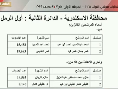 أعلن القاضي حازم بدوي رئيس الهيئة الوطنية للانتخابات، نتيجة انتخابات النواب 2025 للمرشحين بالنظام الفردي في محافظتي البحيرة، ودائرة الرمل في الإسكندرية.