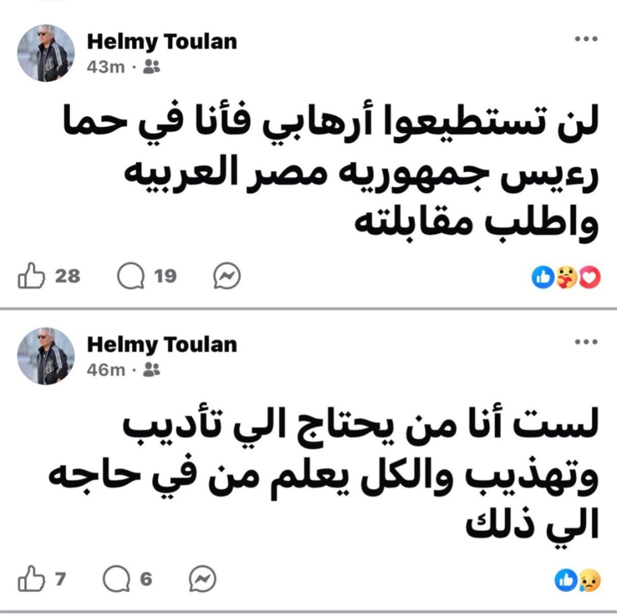 كتب حلمي طولان، المدير الفني لمنتخب مصر في كأس العرب، منشورًا مثيرًا للجدل عبر حسابه الرسمي على موقع فيسبوك، قال فيه: "لن تستطيعوا إرهابي فأنا في حماية رئيس جمهورية مصر العربية وأطلب مقابلته".