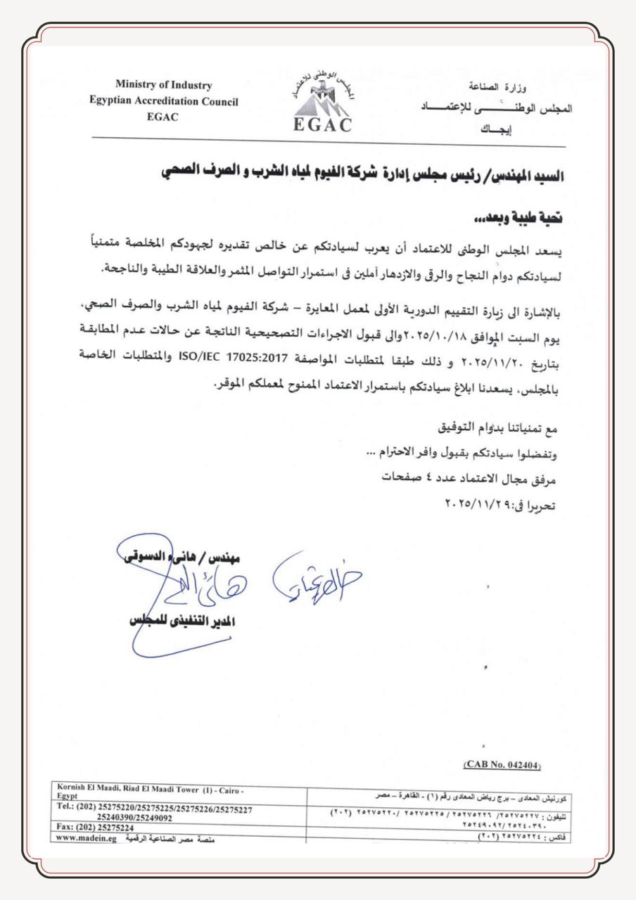 مياه الفيوم: تجديد اعتماد معمل المعايرة بشهادة الأيزو الدولية