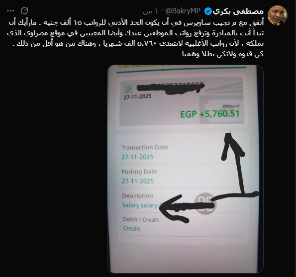 وقال بكرى في تدوينة له: أتفق مع المهندس نجيب ساويرس في أن يكون الحد الأدنى للرواتب 15 ألف جنيه، ما رأيك أن تبدأ أنت بالمبادرة وترفع رواتب الموظفين عندك وأيضا المعينين في موقع مصراوي الذي تملكه، لأن رواتب الأغلبية لا تتعدى 5760 جنيه شهريًا، هناك من هو أقل من ذلك، كن قدوة ولا تكن بطلا وهميا.