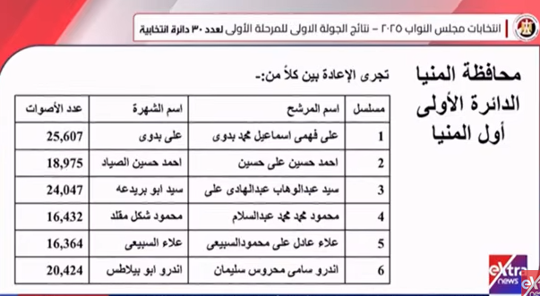 أعلن القاضي حازم بدوي رئيس الهيئة الوطنية للانتخابات، قبل قليل النتيجة الرسمية لانتخابات الـ30 دائرة الملغاة بأحكام قضائية من المرحلة الأولى لانتخابات مجلس النواب 2025، التي أجريت فيها التصويت يومي 10 و11 ديسمبر بالداخل.