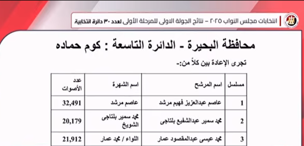 الدائرة السادسة ومقرها الدلنجات، تجرى الإعادة بين كل من: محمد الدانى ومحمود الكومى