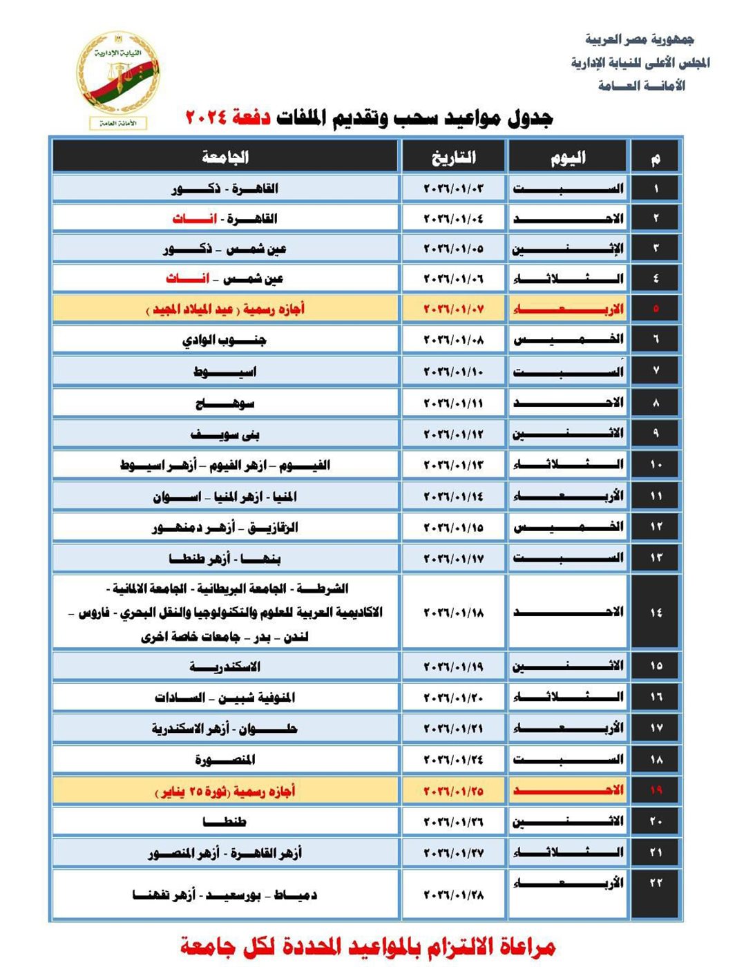 أعلنت النيابة الإدارية جدول مواعيد سحب وتقديم الملفات الصادر عن الأمانة العامة للمجلس الأعلى للنيابة الإدارية والخاص بالمتقدمين لمسابقة التعيين في وظيفة معاون نيابة من خريجي دفعة 2024 من كليات الحقوق، وكلية الشريعة والقانون، وكلية الشرطة.