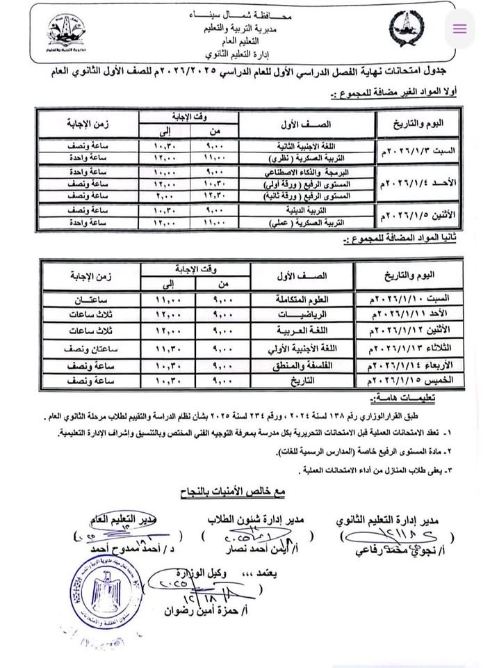 تعليم شمال سيناء تعلن عن جداول امتحانات الصف الأول الثانوي للفصل الدراسي الأول