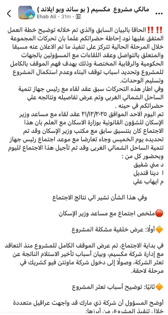 نشرت جروبات متضرري أزمة مشروع «مكسيم» بالساحل الشمالي، ملخص الاجتماع الذي عُقد ظهر السبت 20 ديسمبر 2025، مع مسؤولي هيئة المجتمعات العمرانية الجديدة، بحضور عدد من ممثلي الملاك المتضررين، وذلك بمقر الهيئة بالعاصمة الإدارية الجديدة، في إطار حرص الهيئة على حماية حقوق المشترين وحل مشكلات العملاء.