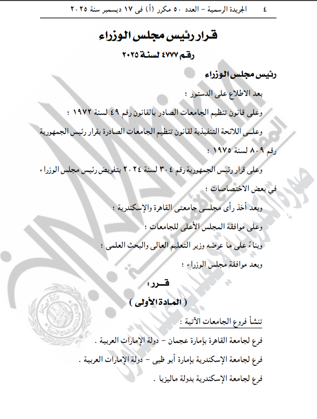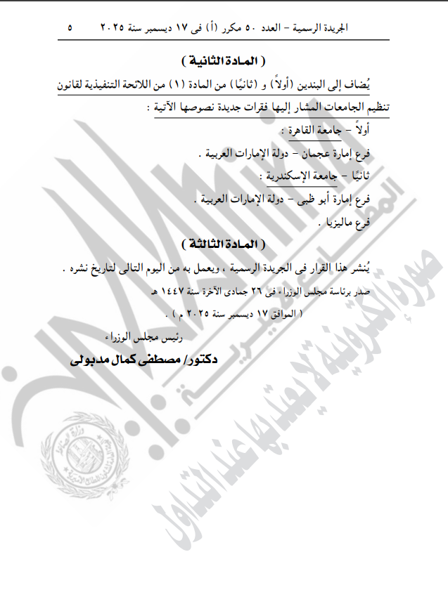 قرار من رئيس الوزراء بإنشاء فروع لجامعتي القاهرة والإسكندرية في الإمارات وماليزيا