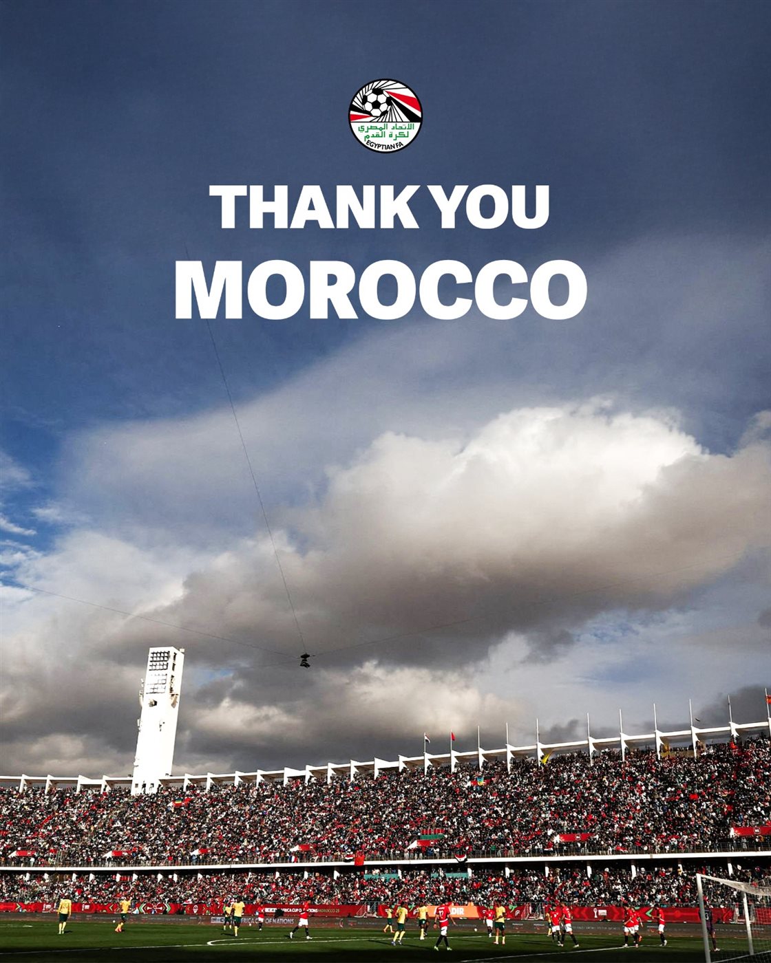 تقدّم الاتحاد المصري لكرة القدم بخالص الشكر والتقدير إلى الجماهير المغربية الشقيقة، على المساندة الكبيرة التي قدمتها لمنتخب مصر خلال مبارياته التي أُقيمت بمدينة أغادير، ضمن منافسات بطولة كأس الأمم الإفريقية.. وجاء في بيان رسمي للاتحاد ما يلي: