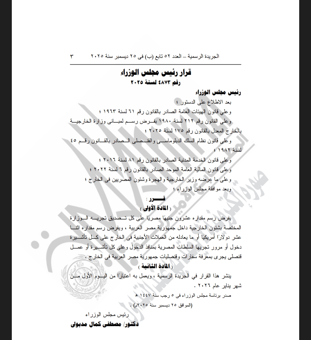 ووجاء فيها أنه بعد الاطلاع على الدستور وعلى قانون الهيئات العامة الصادر بالقانون رقم 61 لسنة 1963 ؛ وعلى القانون رقم 212 لسنة 1980 بفرض رسم لمبانى وزارة الخارجية بالخارج المعدل بالقانون رقم 175 لسنة 2025 ؛ وعلى قانون نظام السلك الدبلوماسى والقنصلى الصادر بالقانون رقم 45 لسنة 1982، وعلى قانون الخدمة المدنية الصادر بالقانون رقم 81 لسنة 2016 ؛ وعلى قانون المالية العامة الموحد الصادر بالقانون رقم 6 لسنة 2022 ؛ وعلى ما عرضه وزير الخارجية والهجرة وشئون المصريين في الخارج ؛ وبعد موافقة مجلس الوزراء، قــــرر: