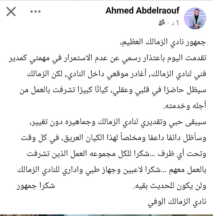 وأكد عبد الرؤوف، عبر بيان نشره على صفحته الرسمية بموقع التواصل الاجتماعي «فيسبوك»، أنه تقدم باعتذار رسمي عن عدم الاستمرار في منصبه كمدير فني للفريق، موضحًا أن قراره جاء بعد فترة قاد خلالها تدريبات الزمالك بكل إخلاص واجتهاد.