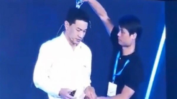 وكان لي يتحدث عن تطبيقات الذكاء الاصطناعي في خطاب عندما اقترب منه الشاب وسكب الماء فوق رأسه ثم ابتعد، بحسب ماذكرته وكالات.