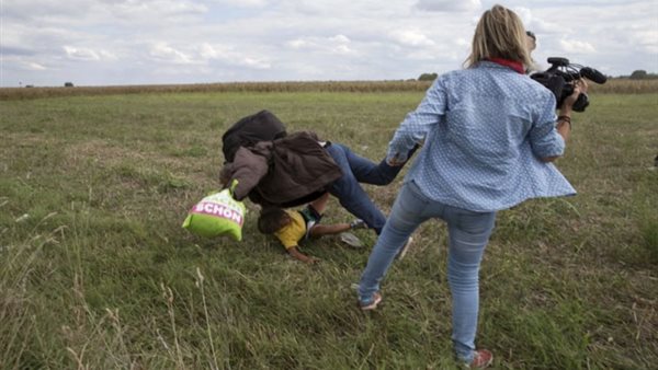 وفي عام 2015 تعرضت المصورة “بيترا لازلو” لانتقادات كبيرة بعدما ظهرت وهي تركل أبا يحمل طفله بين ذراعيه خلال مطاردة للشرطة، بحسب “سكاي نيوز”.
