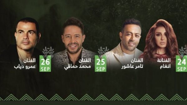 ومن المقرر أن تقام حفلة الهضبة عمرو دياب يوم 26 سبتمبر الحالي في مدينة الملك عبد الله الرياضية، أما حفلتا تامر عاشور وأنغام ستقامان في 24 سبتمبر بمدينة الملك عبد الله الرياضية.