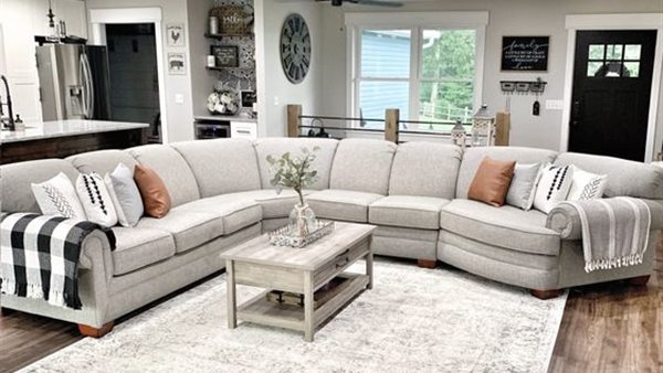 الأريكة باللون الأبيض مع وسائد بنفس اللون، وأخرى ممزوجة باللون البيج، مع وسائد لونها بيج، مع سجادة من لون البيج، وتربيزة خشبية عليها زهرية من اللون الأخضر، بخلفية من باقة من الخشب، معلق عليها أوراق من الشجر الصناعي.